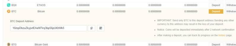 Het overschrijven van coins naar de Binance-wallet is eenvoudig. Ga naar 'Funds', bovenin het scherm en daarna 'Deposits Withdrawels'. Indien je bitcoins wenst over te maken klik je van 'bitcoin' op 'deposits'. Er verschijnt een bitcoin-adres waar je je bitcoins naar over moet maken.