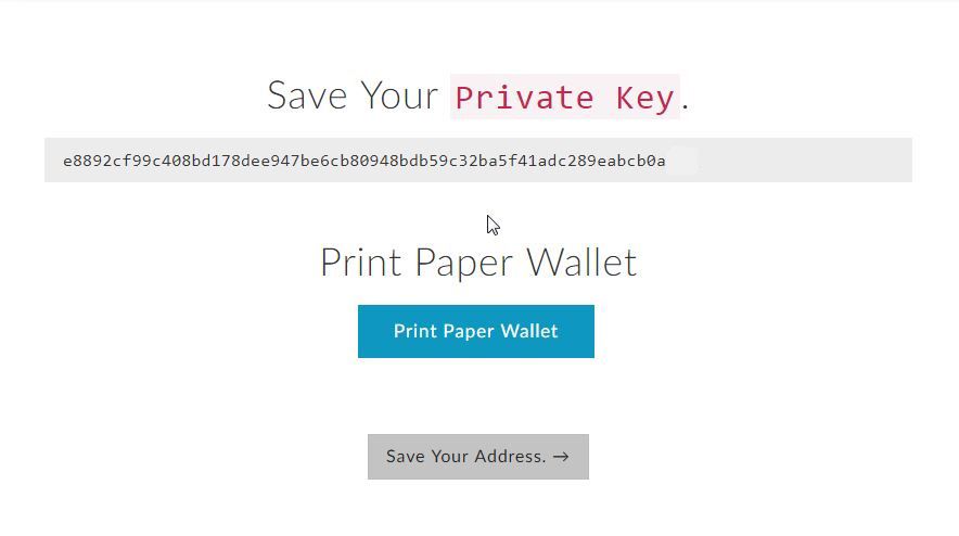 In het volgende venster zie je je Private Key in niet-gecodeerde vorm. Met deze key is het mogelijk direct in jouw wallet te komen, zonder password! Wij raden aan deze code niet digitaal op te slaan, maar om in plaats daarvan de Paper Wallet uit te printen. Dit is een papieren blad waarmee je te allen tijde weer in je wallet kunt komen, mocht je je wachtwoord of Keystore File kwijtraken.