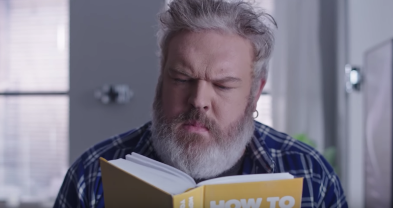De advertentie volgt de acteur die luistert naar aanbiedingen voor advertenties waarin hij altijd iets op zijn rug draagt en zegt: "Hodor." Moe van het feit dat hij is gedoken, zegt hij tegen zijn agent dat hij iets "met een stropdas" moet vinden. Nou, het resultaat is hieronder: