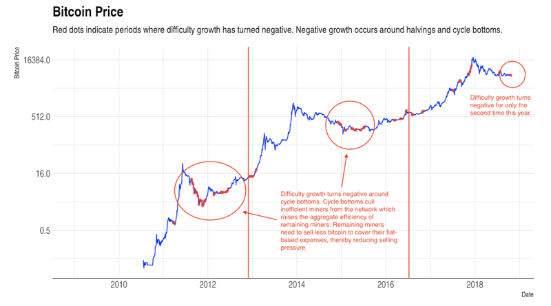 Element heeft de correlatie onderzocht en geschetst tussen afnemende mining moeilijkheidsgraad en bitcoin-prijsbewegingen, naast andere effecten. Wat bleek is dat het zeldzame geval van vermindering van de mining moeilijkheidsgraad zich vaak tegen de onderkant van marktcycli voordoet, wanneer de verkoop van bitcoin afneemt en de prijzen hun dieptepunten vinden.