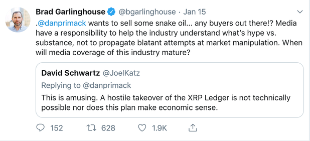 David Schwartz, CTO van Ripple, zegt dat een vijandige overname van de XRP Ledger technisch niet mogelijk is en dat het ook niet economisch verantwoord is. Brad Garlinghouse, CEO van Ripple, verwijt media dat ze de verantwoordelijkheid hebben om de industrie te helpen begrijpen wat hype is versus substantie, en niet om flagrante pogingen tot marktmanipulatie uit te dragen. Hiermee doelt hij op de rol die media speelt bij het verspreiden van het gerucht, welke vluchtig werd overgenomen en verspreid.