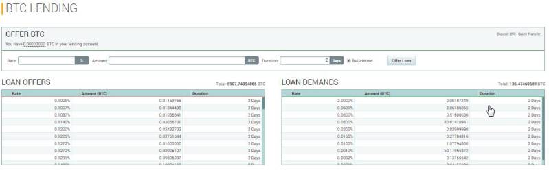 - Geef aan hoeveel bitcoins u wenst te lenen of uit te lenen en tegen welke rente en looptijd. Ook is het mogelijk een gevraagde of aangeboden lening te accepteren bij 'Loan offers' of 'Loan demands'.
